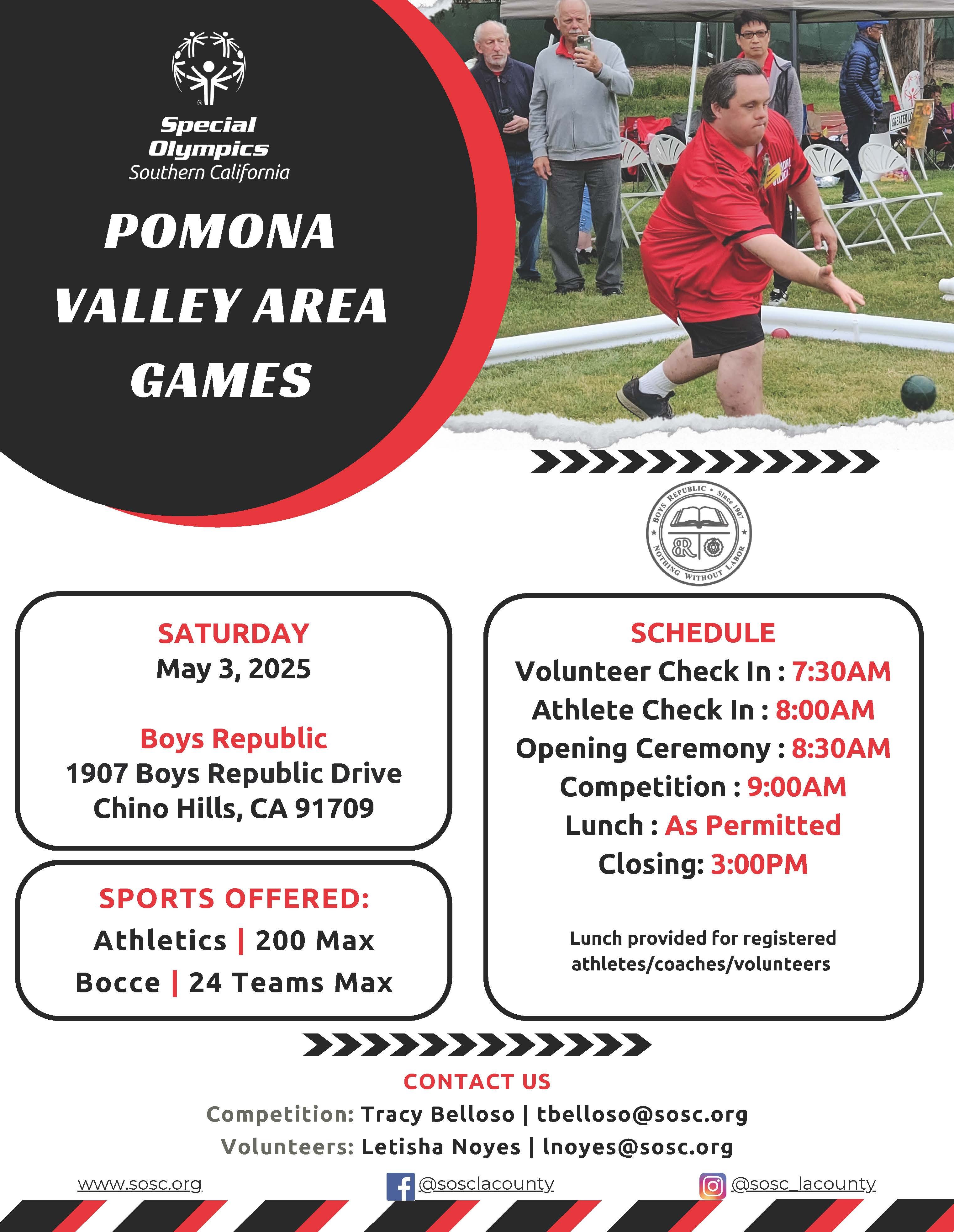 Through the power of sports, people with intellectual disabilities discover new strengths and abilities, skills, and success. The athletes find joy, confidence and fulfillment -- on the playing field and in life. They also inspire people in their communities and elsewhere to open their hearts to a wider world of human talents and potential, so come out and join us on Saturday, May 3rd to support our Pomona Valley athletes! Special Olympics athletes from the Pomona Valley and surrounding areas will compete in Athletics and Bocce.