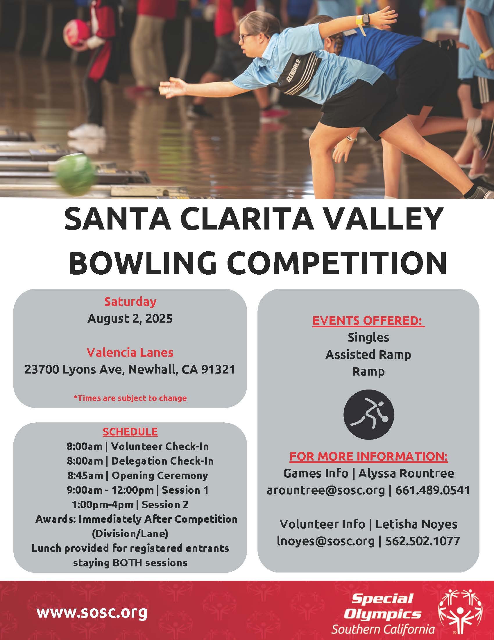 Through the power of sports, people with intellectual disabilities discover new strengths and abilities, skills, and success. The athletes find joy, confidence and fulfillment -- on the playing field and in life. They also inspire people in their communities and elsewhere to open their hearts to a wider world of human talents and potential, so come out and join us on Saturday, August 2nd to support our LA County North Area athletes! Special Olympics athletes from LA North and Kern areas will compete in Bowling!